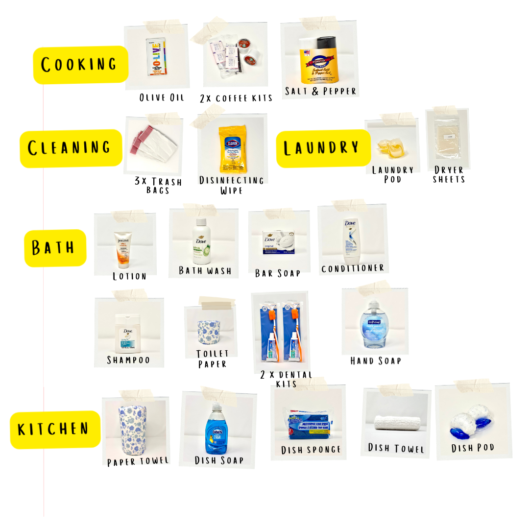 Each kit includes the everyday essentials — dishwashing supplies, laundry basics, trash liners, toiletries, paper towels, and toilet paper — thoughtfully bundled to eliminate last-minute store runs and avoid unnecessary inconvenience.